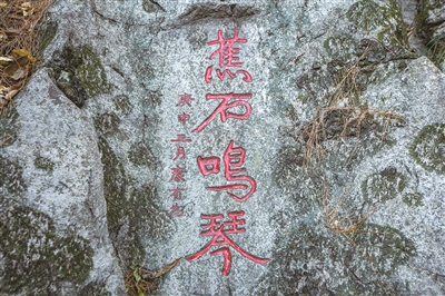 靠近西湖国宾馆北门有一处上山口 ,穿过写着“丁家山”字样的石头牌坊,拾级而上二十几步,正对着一块石壁,绕到它后面就能看到红色的 “蕉石鸣琴”四字题刻,旁边落款“庚申三月康有为”。两组石壁形成一个小小的环绕空间,旁边种有芭蕉,帮你理解“蕉石鸣琴”四个字的含义。