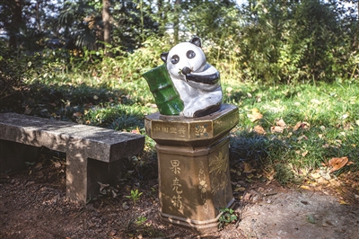 还有一个有意思的细节,丁家山上能见到许多大熊猫造型的果壳箱。上世纪七八十年代,这种产自宜兴的陶瓷果壳箱一度遍布全国各大公园和景区,在如今的杭州已经不多见了。
