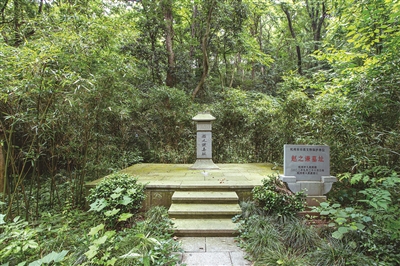 丁家山公交车站旁边就是晚清书画篆刻名家赵之谦的墓址,马路对面还有座十字形的纪念亭——半隐亭。赵之谦是“海上画派”的先驱人物,与任伯年、吴昌硕并称“清末三大画家”。往南几百米还埋葬着京剧表演艺术家,有“江南活武松”之称的盖叫天。墓道上有座石亭“慕侠亭”,上面挂着一块“学到老”匾额,这三个字为黄宾虹所写,也是盖叫天一生的座右铭。
