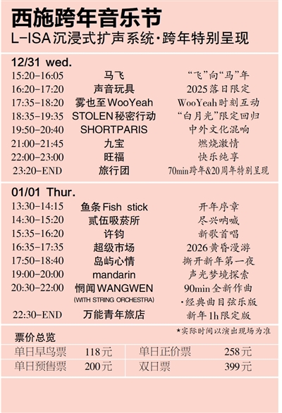 2025年12月31日-2026年1月1日,都市快报和你相约诸暨西施滩大草坪,和旅行团、声音玩具、万能青年旅店、旺福等16组音乐人一起,在歌声中告别2025,迎接满怀“爱与幸运”的崭新2026。