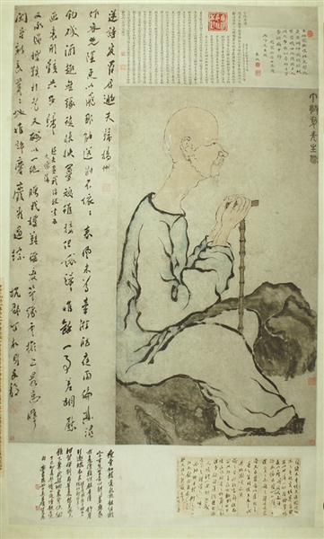 《丁敬身先生像》轴为“扬州八怪”之一罗聘所绘,画面中丁敬倚杖坐石,神态清逸。丁敬(1695-1765),字敬身,浙江杭州人,为“浙派”篆刻开山鼻祖,西泠八家之首。罗聘(1733-1799)为其晚年挚友金农弟子。画像左侧题有丁敬手书《送诗客罗君遁夫归扬州》《承赠棕鞋》二诗,点明了画像的创作背景,当时罗聘以“诗客”身份赴杭拜谒丁敬,临别时,罗聘为丁敬写像带归扬州以作留念。