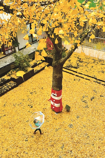昨天雨后,曙光路上的“阅见西湖”院子里,银杏叶飘落,满地金黄。 记者 陈中秋 摄