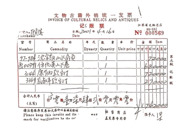 受访者供图 原江苏省文物总店销售发票显示,《仿仇英山水卷》于2001年4月16日被“顾客”以6800元价格购买。