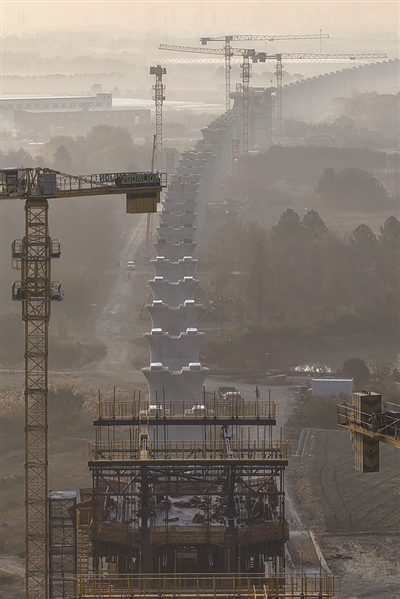 12月20日清晨拍摄的通甬高铁嘉兴特大桥施工现场