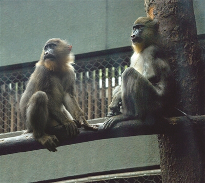杭州动物园这两只山魈一公一母,两者在体形上相差甚多,这导致母山魈的地位和权力很弱,吃食都得先让着公山魈。
