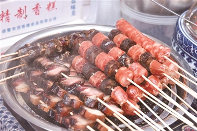 走进北岸翻轩骑楼下的商业街,河边各式各样的酱货整整齐齐排开,腊肠、酱鸭、酱鸡、酱鹌鹑、猪头肉、鱼干……伴随着浓郁酱香扑面而来,几乎连绵不断整条街市,味觉视觉双重冲击。锅里一串串热乎乎的香肠、酱肉可以直接买了吃,立马品尝到这咸香滋味。
