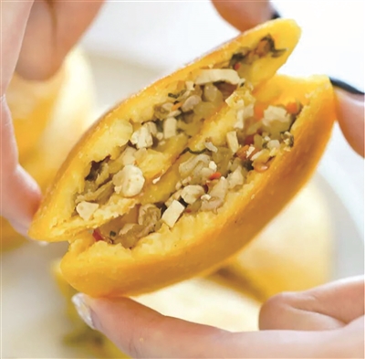 桐庐玉米饼,桐庐方言又称六谷饼。老底子手艺,实打实的分量。以玉米粉为主料制饼皮,里头包裹着桐庐地方特色浓郁的馅料,油里煎炸后香酥可口,尝一口满嘴留香。