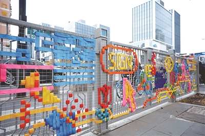30米长的沿街围栏,被FML团队打造成公共艺术作品《数字街码Weaving the Digital Block》。在明媚跳跃的色彩中,机器人、数据线、电路纹样、文三路标识、“0101PARK”字样、表情包图案……如同一盘时光磁带,记录着街区的昨天与今天。