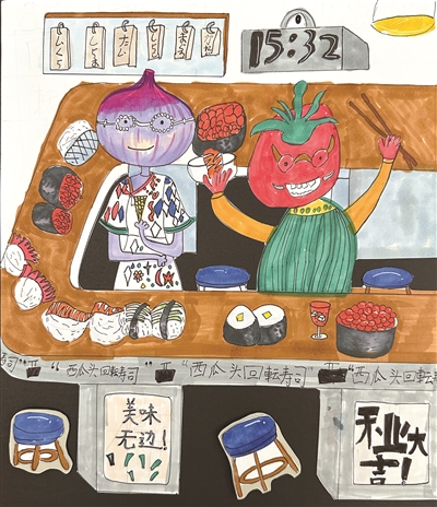 傅翌轩小朋友的画中,洋葱和番茄成了厨师,捏出了一个个美味的寿司,看着就很诱人呢! 作品:《美味的旋转寿司》 漫画狮: 杭州市嘉绿苑小学二(6)班 傅翌轩