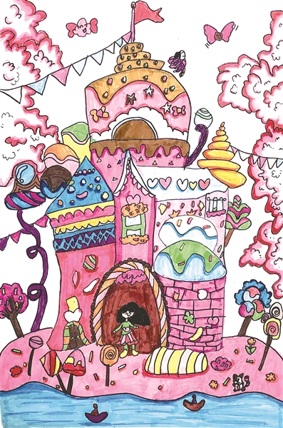 田芮嘉小朋友的画笔更像施了魔法,直接展现出一个五彩缤纷的糖果童话世界。粉嘟嘟的甜甜圈变成了小房子的屋顶,各种颜色的棒棒糖化身路灯,连小路都是用一颗颗彩色硬糖铺成的。走进这个世界,仿佛连空气里都飘着甜甜的香味,让人忍不住想踮起脚尖,和糖果小精灵们跳一支快乐的舞。 作品: 《未来世界糖果城堡》 漫画狮: 杭州江南实验学校 二(5)班 田芮嘉