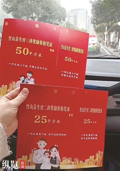 “生育二孩购房奖补25平方米,生育三孩奖补50平方米”。近日,有网友晒出一张“竹山县生育二孩奖励资格凭证”和一张“竹山县生育三孩奖励资格凭证”,称湖北十堰竹山县针对生育二孩、三孩家庭给予购房奖补,不少网友纷纷表示“真心羡慕了”。
