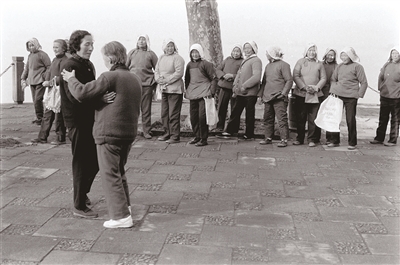 那时的银泰百货门口,早晚都会有很多市民,聚在一起跳舞健身,老懈的作品记录下这样一幕:一对男女舞伴,当街翩翩起舞,舞姿像流水一样自然。