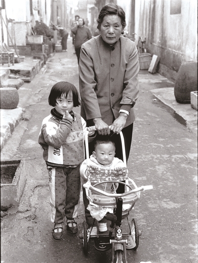 照片中,一个老奶奶推着摇篮车,带着一对可爱的孙辈,缓缓移步在杭州的一条老街巷,周围陈设有很遥远的年代感。