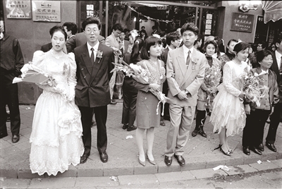 上个世纪八十年代,杭州酒家的婚宴是上档次的,每逢吉日,婚宴都排得满满的。一组摄于1990年左右的照片中,一天中至少有三对新人在杭州酒家举办婚礼,有伴郎模样的人着急地查看手表时间。老懈介绍说,当年杭州酒家的家宴,大多以婚宴为主,能在这里办酒席的人家,家里都是有一定经济实力的。