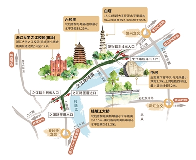 之江路隧道紧邻西湖风景名胜区,隧道建设时,需穿越白塔、六和塔、钱塘江大桥、浙江大学之江校区(旧址)及中河5个国家重点文物保护区。是国内涉及重要文物遗产最多、实施难度最高、保护要求最严的单体市政地下工程之一。