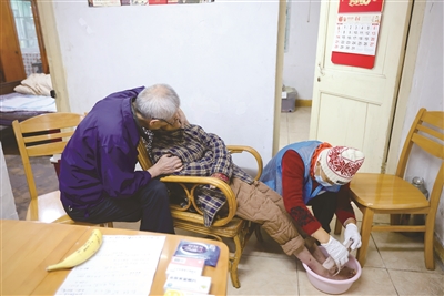 记者 江玥 摄 刘秀英正在给徐奶奶洗脚