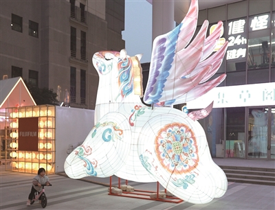 这座花灯的灵感,源自敦煌壁画中独一无二的“天马”形象。天马作为敦煌文化中古代四大瑞兽之一,在《史记》《水经注》等典籍中早有记载,是祥瑞、天命与强健精神的象征。