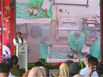 据悉,相关繁育工作在中国与印尼科研团队密切合作下完成,采用了辅助生殖技术。在茂物野生动物园,现场来宾通过视频了解大熊猫幼仔出生以来的健康检查情况。截至目前,其体重已明显增长,生长发育状况良好。