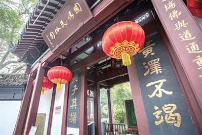 园内还有一座月老祠,坐东朝西,面阔三间,硬山顶,前檐柱是石柱,左右植古柏,室内祭祀月老,月老手执婚书,默默祝愿天下有情人终成眷属。塑像两边是彩色壁画,一边描述明代才子唐伯虎三笑姻缘故事,另一边描述唐代状元郭远振牵红线选宰相之女为妻的故事。心怀期许的游客,可在月老祠中虔诚许愿,祈求天赐良缘。