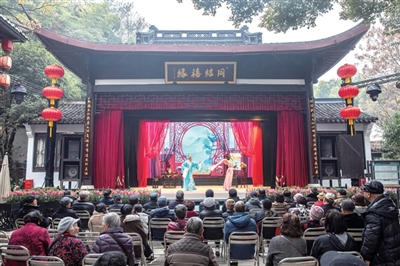 这里也是杭城市民听戏的好地方,禧园大舞台上,黄龙越(杭)剧团专业演员们在这里全年有演出,婉转的越剧、醇厚的杭剧还有江南丝竹等轮番表演,让戏迷过足戏瘾。