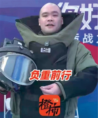 郑桢楷穿着防爆服向记者展示排爆姿势