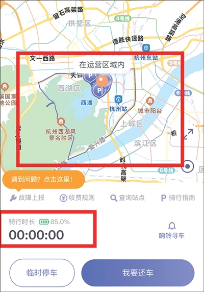 红圈紫色区域为可以骑行运营范围
