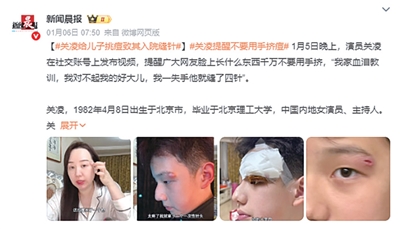 近日,演员关凌在社交账号上发布视频称“你有没有体会过心如刀割”,提醒广大网友脸上长什么东西千万不要用手挤。在其发布的视频中可以看见其家人的眉毛下长了个大包,一开始以为是青春痘,就用一次性针头挑了一下,没想到那个包越来越大,医院皮肤科无法处理,最后在外科做了引流手术。