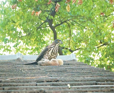 凤头鹰抓着鸳鸯,扯毛、吃肉,至少半个多小时。周围的人看到这一幕,都是震惊加怜悯,大家不知道该怎么处置。