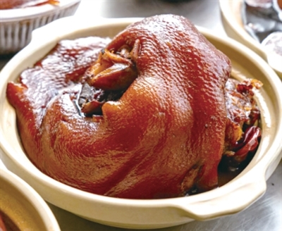 烧出来的蹄髈,色泽深红,浓香扑鼻,酥而不烂。