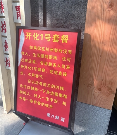橙友发的图片里是一则公告:如果你在杭州暂时没收入,生活遇到困难。您可以来店里,告诉服务人员来份开化1号套餐,吃完直接走,不用客气!