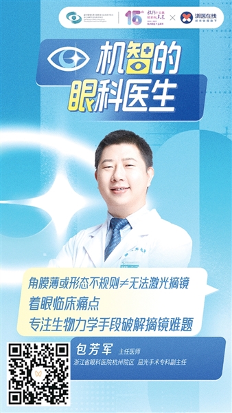 为何专注于圆锥角膜?其实,这与包芳军的个人经历有关。他从小戴眼镜,还在读书时就萌生了摘镜想法,检查后却发现自己疑似圆锥角膜,经过两年多的随访,才排除圆锥角膜的可能,最终接受了最适合自己的表层角膜激光手术。