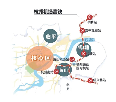 未来,在萧山机场坐上高铁,经桐乡站后转入沪杭高铁,可直达上海浦东国际机场和上海虹桥机场。绍兴的旅客可以通过这条高铁快速抵达萧山机场;嘉兴、湖州等地的旅客也可以通过换乘,享受到空铁联运的便利。