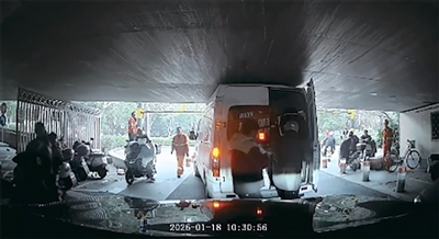 发帖网友“lucky somebody”说,“1月18日上午10点多,我开车沿金华路由南往北行驶,接近轻纺桥桥洞时,发现一辆浙F牌照的白色面包车卡在轻纺桥下,把道路堵住了。桥下入口有个2.2米限高警示牌,司机应该是预判失误了。