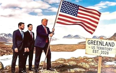 美国总统特朗普1月20日凌晨在社交媒体上发布图片,他手拿美国国旗登上格陵兰岛,身后站着美国副总统万斯和国务卿鲁比奥,旁边指示牌上写着“格陵兰岛2026年成为美国领土”。