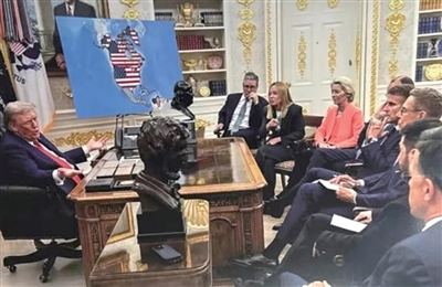 特朗普当天还发布了另一张图片:他在白宫办公室与欧洲领导人会面,后面展板上的地图中,除美国本土外,加拿大、格陵兰岛和委内瑞拉均被美国国旗覆盖。