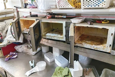 而在一家“小碗菜”外卖门店,灶台黢黑一片,地板黏脚且散落着多个烟头,3台微波炉内满是黄色黏液。这家在外卖平台宣称“大厨现炒,新鲜食材”的店,正在用电饭煲加热一锅“红烧排骨”料包。有顾客在平台点评,“打包盒是热的,菜是凉的,一看就知道是微波炉加热”。