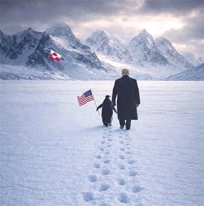 白宫官方社交账号当地时间23日在X平台上继续为“夺取格陵兰岛”造势:它发布一张人工智能(AI)生成的图片,画面中美国总统特朗普牵着一只举着美国国旗的企鹅,穿过雪地,不远处插着一面格陵兰岛旗。“拥抱企鹅。”白宫写道。