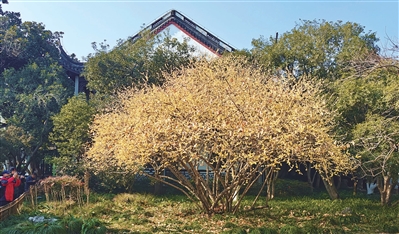 花港观鱼公园蒋庄内的蜡梅也有很多人打卡,这棵蜡梅眼下正处于最佳观赏期,满树金黄,满园飘香,火到树下“长满了人”。