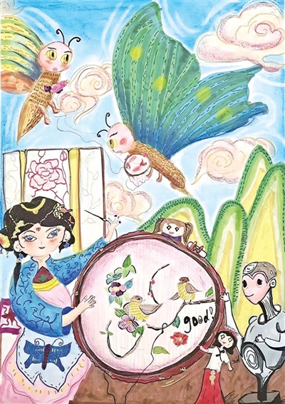 插画狮:《绣间蝶舞,非遗新韵》杭州市钱塘区学正小学三(10)班 方婧希 指导老师:陈以娟