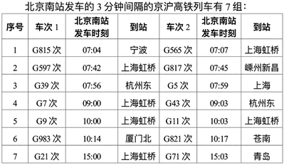 新图实施后,通过技术升级,京沪高铁发车间隔时间最短实现3分钟,最密集时1小时内达到3组列车,在维持行车秩序的同时,进一步提高了线路使用效率,为提升运力提供保障。北京南站发车的3分钟间隔的京沪高铁列车有7组,时间覆盖7:04至15:03。