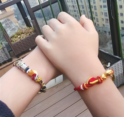 “我老公比较喜欢买串串,我手上的串串都是他给我买的,这次他给双胞胎孙子孙女各买了一条普陀山的红绳,咦,发现比我们大人戴更可爱、更喜庆。特别是去接他俩放学,他们挥舞着小手向我们跑过来的时候,别提有多开心了。”