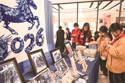 杭州市实验外国语学校“蓝晒植影”社团的孩子们运用蓝晒工艺,结合马年元素,设计出独特的蓝晒项链及马年装饰画。 学正第二实验学校的学生们精心制作了小马冰箱贴,灵巧的小马身影,既富有艺术美感,又多了一份和生活交融的创意之美。 杭州市采荷第三小学的一位美术老师,每年都会亲手制作挂历,送给全校老师和班级里的学生。今年,他独家定制的马年主题挂历刚刚出炉,立刻成了校园里的“明星作品”。 这幅挂历打破了传统挂历的方正样式,被巧妙地设计成马头造型。作品以黑色、红色、蓝色和橙色为主色调,色彩鲜明、对比强烈,充满视觉冲击力。马的眼睛被画成弯弯的月亮,灵动又富有想象力,仿佛在注视着新年的到来。 钱江外国语实验学校的师生们,用iPad共创了百幅马年插画,并精选其中的佳作制成了新春贺卡。 新的一年,校园里的“小骏马”们已经蓄势待发,向着更广阔的天地快乐奔跑!