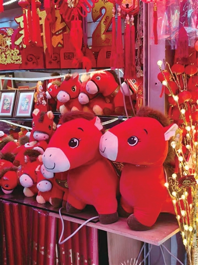 记者注意到,今年各家年货店的“C位”基本上被前段时间爆火的“哭哭马”“笑笑马”和各种含有马元素的公仔占领。从经典的中国红到亮眼的紫、蓝配色,从小巧玲珑的钥匙扣到半人高的大号公仔都有,造型也是五花八门:有的顶着马毛发髻憨态可掬,有的印着“马到功成”“马上有钱”的讨喜文字,还有手工编织的布艺小马,精致又可爱。