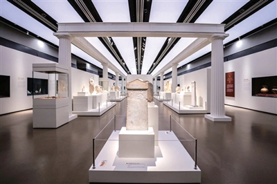 展厅设计借鉴古希腊神庙建筑风格,重点展品包括基克拉迪抱臂小人像、米诺斯彩绘蛋壳陶杯、次迈锡尼青铜长剑、阿尔忒弥斯大理石雕像、黑绘风格陶双耳罐、红绘风格陶混酒瓮、桃金娘金冠等。