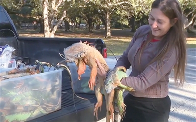 2月1日因冬季风暴袭击,美国佛州出现“天降鬣蜥”,不少僵硬的蜥蜴直挺挺地从树上落下。当地媒体播出的画面中,鬣蜥专家杰西卡·基尔戈尔1日上午收集了大把鬣蜥。她说气温升高后,鬣蜥会醒来爬回树上。