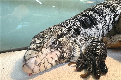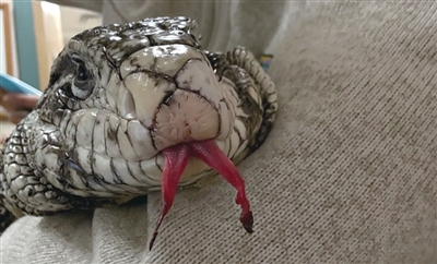 兽医体检发现这只鬣蜥“极度虚弱、体重过轻且行动不便”。鬣蜥的舌头还因长时间暴露于低温环境,出现了冻伤和肌肉无力症状。这种情况会导致冷血动物在低温环境下出现细胞功能衰竭的现象。兽医给蜥蜴做了手术,截掉了一小部分舌头。