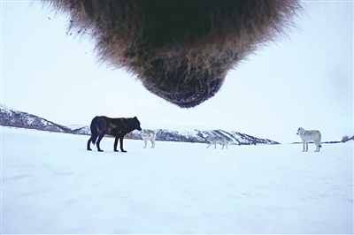 摄像机还拍到了一只饿熊冬眠醒来遇到了一群狼。这是一次和平的交流。文森特说:“我想它们认为不值得打架,对视了一眼,各自走了。”