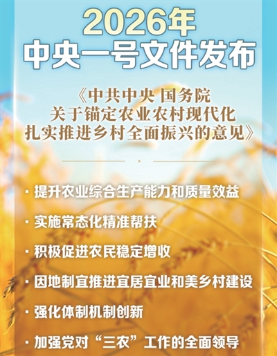 党的十八大以来第14个指导“三农”工作的中央一号文件3日由新华社受权发布,对锚定农业农村现代化、扎实推进乡村全面振兴进行了部署。