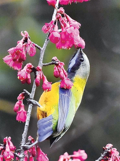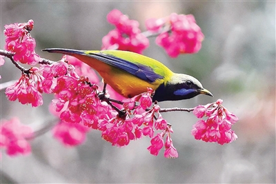 杭州植物园已有樱花开放,引来小鸟吸食花蜜。橙友“辰曲16” 摄