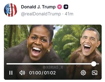 特朗普在社交媒体“真实社交”上的账号美东时间5日晚11时44分发布一个约1分钟的视频片段,片段结尾有两个灵长类动物的画面,它们的脸被剪辑成了奥巴马及其夫人米歇尔的笑脸。该片段因涉嫌种族歧视引发各方强烈不满和谴责。白宫一名高级官员6日中午对媒体说,视频片段为白宫一名雇员“误发”,已被删除。